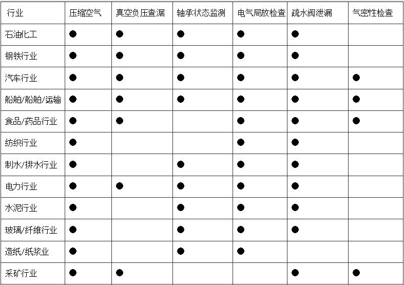 壓縮空氣及氣體檢漏、電氣局部放電檢測、真空負壓檢漏、蒸汽疏水器檢測、軸承聽診、閥門內(nèi)漏檢測、氣密性檢查、紅外溫度成像等檢測