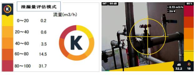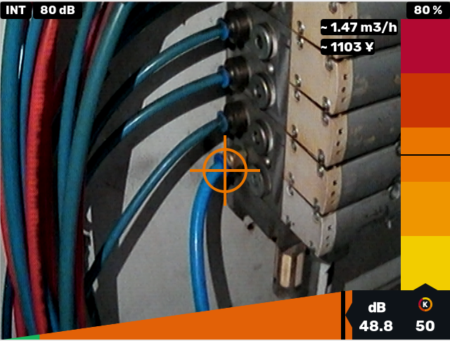 LEAKSHOOTER工業(yè)聲學成像儀在移動掃查過程中,檢測到泄漏信號后會在彩色液晶大屏幕上顯示出泄漏點框來。在液晶屏幕上的泄漏源是黃色(說明泄漏較小,信號較弱)或者紅色(說明泄漏較大,信號強)實時可見圖像。同時在液晶屏幕側(cè)邊的橫條光柱以不同顏色和具體泄漏量出來,并能通過儀器設定自動計算出泄漏點浪費的金錢。