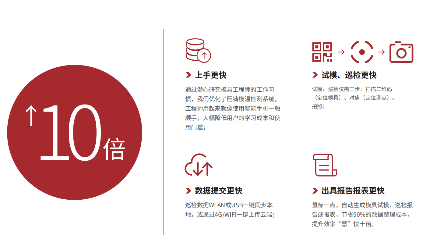 ? ? 基于模溫檢測(cè)概念,我們將壓鑄數(shù)據(jù)管理系統(tǒng)集成于模溫儀,通過云端將試模、巡檢數(shù)據(jù)與所有參與人員互聯(lián),試模、巡檢數(shù)據(jù)不再是原始的“數(shù)字”或“字符”,而是通過算法變?yōu)榫哂羞壿嫷臄?shù)據(jù),構(gòu)成有價(jià)值的信息,助力您打造工業(yè)4.0的智能壓鑄工廠。
