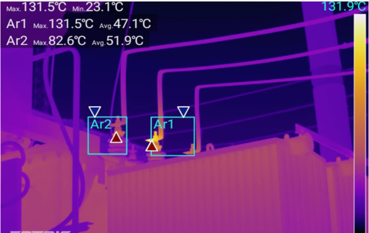 變壓器箱體由于油路管道堵塞、渦流損耗、內(nèi)部異常等造成發(fā)熱,熱像儀對(duì)變壓器箱體的檢測(cè)可以使變壓器箱體始終處于正常溫度,避免變壓器因溫度過高而損壞。